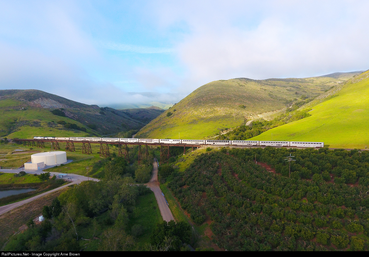 The coastal fog is rolling in over the hills by San Luis Obispo as a late Coast Starlight makes it's way over the Stenner Creek Viaduct.