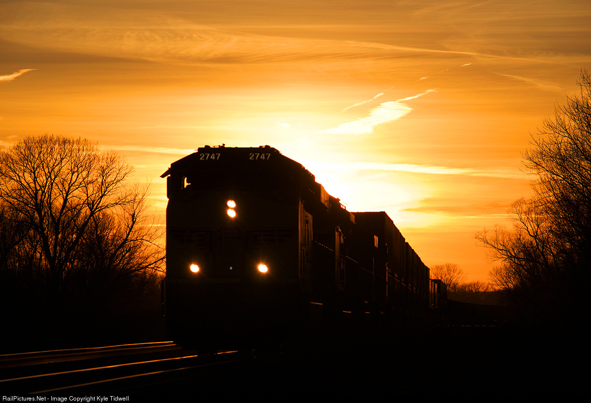 After a busy day on the UP transcon, UP 2747 emerges from the sunset eastbound to end a good day.