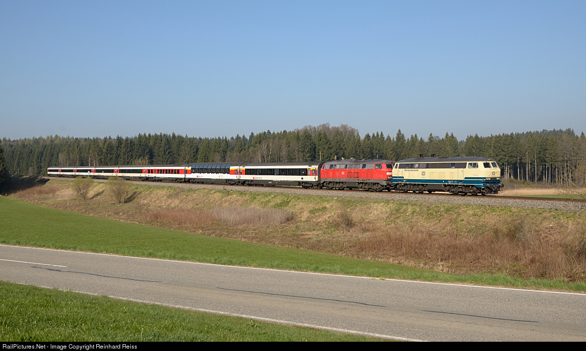 | 218 460 in the former oceanblue-beige livery and 218 421 in standard livery head EC 191 Zurich - Munich to Munich. |