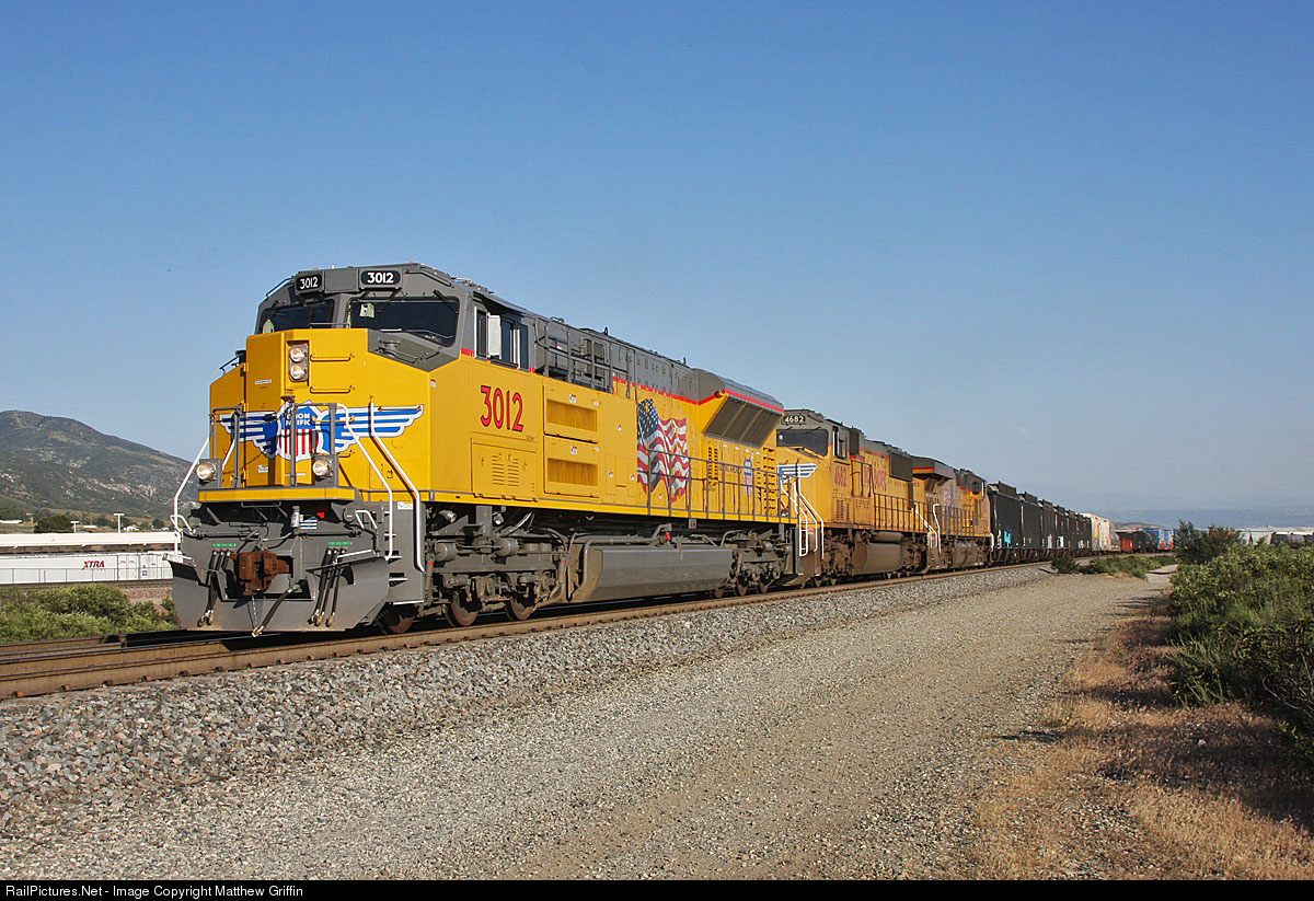 | UP's exclusive 3012, one of only 2 EMD SD70AH-T4's running on the property leads the West Colton to Roper manifest at Dike on the Mojave Sub. |