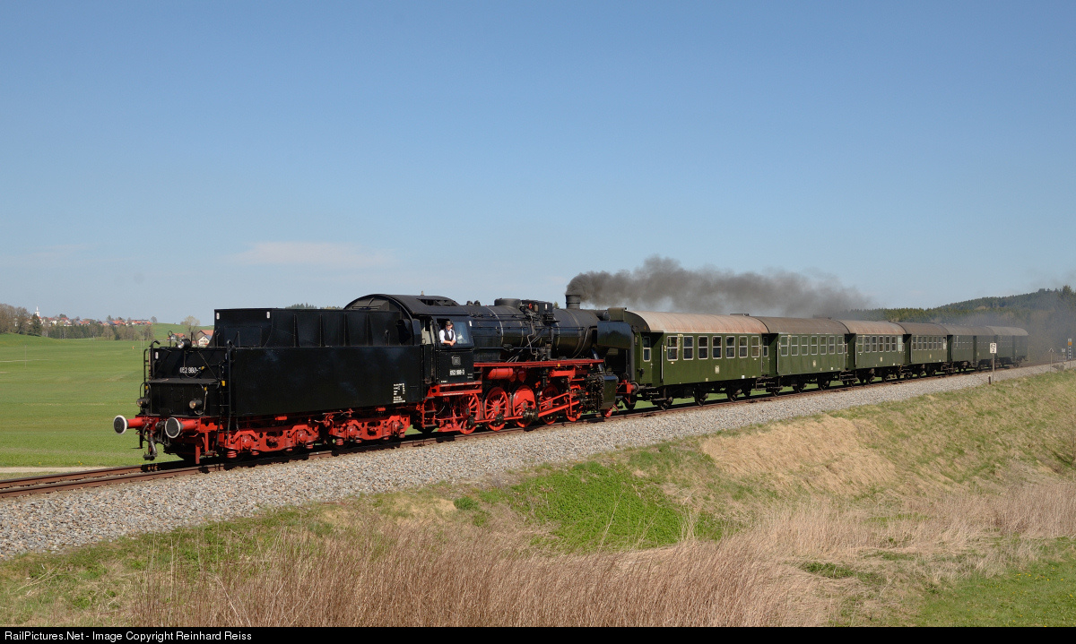 | Renumbered this weekend as 052 988-3 (computing number introduced in the early seventies) 50 2988 from Dampflokfreunde Schwarzwald-Baar e.V. heads a photo charter special from Leutkirch to Ravensburg. |