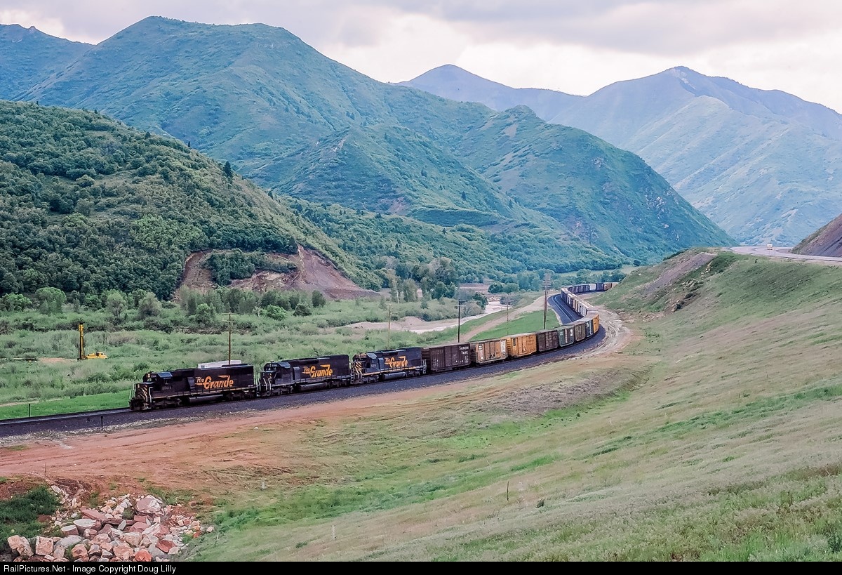 Running elephant style, a Rio Grande SD50 and two SD40T-2’s lead an eastbound freight onto the post-1983 alignment of the main line near Thistle, Utah. A huge mudslide and subsequent flooding wiped out the small town, forcing a closure of the Rio Grande main line for several months. The train is diverging from the former alignment of U.S. Route 6, while the new Route 6 is on the embankment on the right. The pre-1983 Rio Grande alignment is across the Spanish Fork.