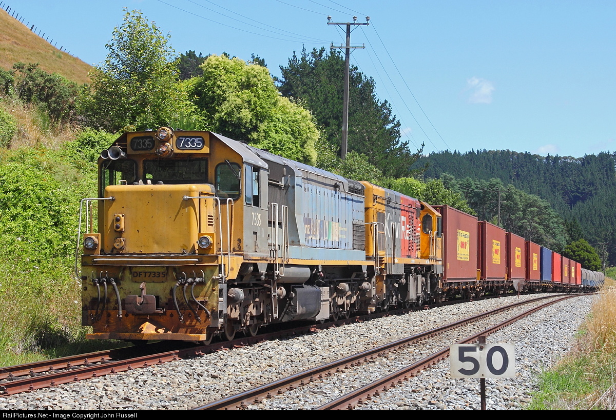 | 7335 was last of its class in service with Tranz Rail blue livery. Now withdrawn, rumor is that it might be resurrected in spite of heavy repairs needed to cab. Hutt workshops can make these locomotive first introduced in 1979 look and run like new but at a cost of over $1M each. Train 535 serves the huge Fonterra milk powder factory at Whareroa and includes empty milk tanks at rear. |