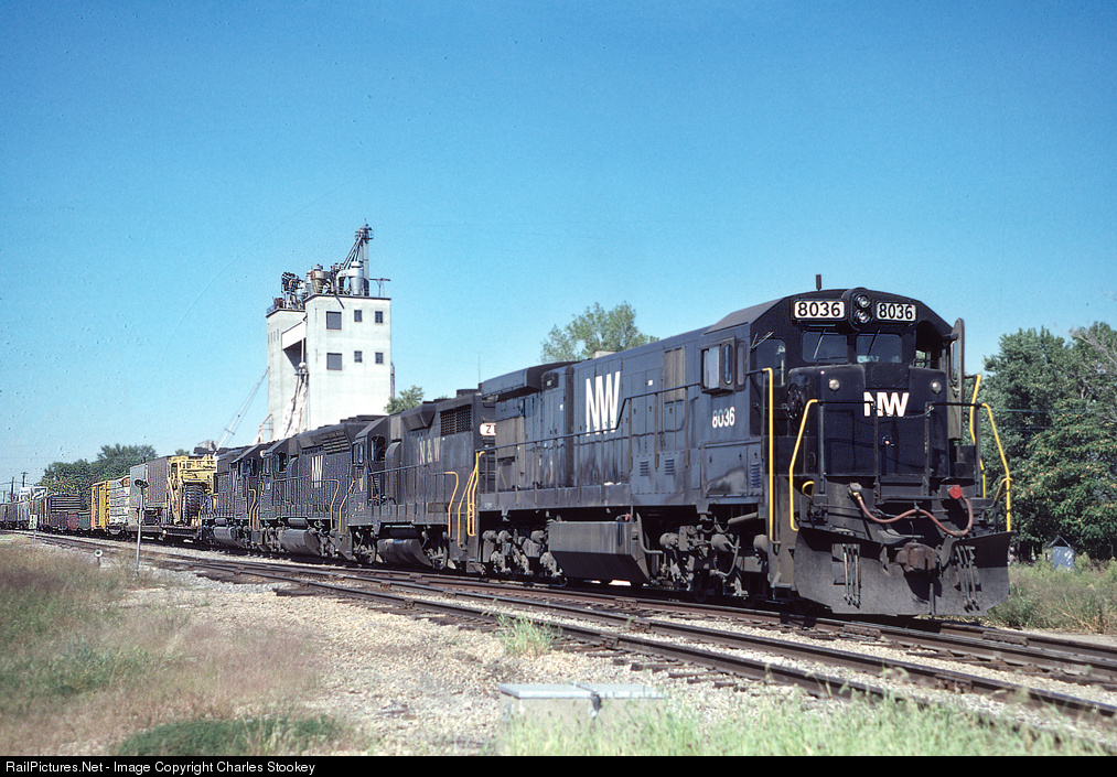| MOBERLY MO Sept 16 1979 -- Norfolk & Western C30-7 8036, handling the head end of a mixed freight, has stopped just past mile post 148 . |