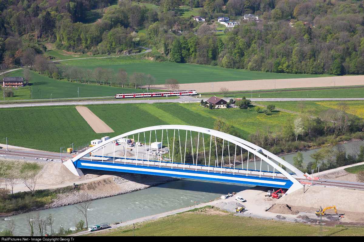 | Regional train 6113 from St-Gingolph to Brig with "Domino" RBDe 560 push pull train of RegionAlps is passing the new "Pont des Paluds" bridge over the Rhone, which brings the Simplon line from Lausanne into the canton Valais. The 125 meter long bowstring steel bridge was inaugurated on december 19th 2016, replacing two old single truss bridges from 1903 and 1923 with a span of 70 meters only. |