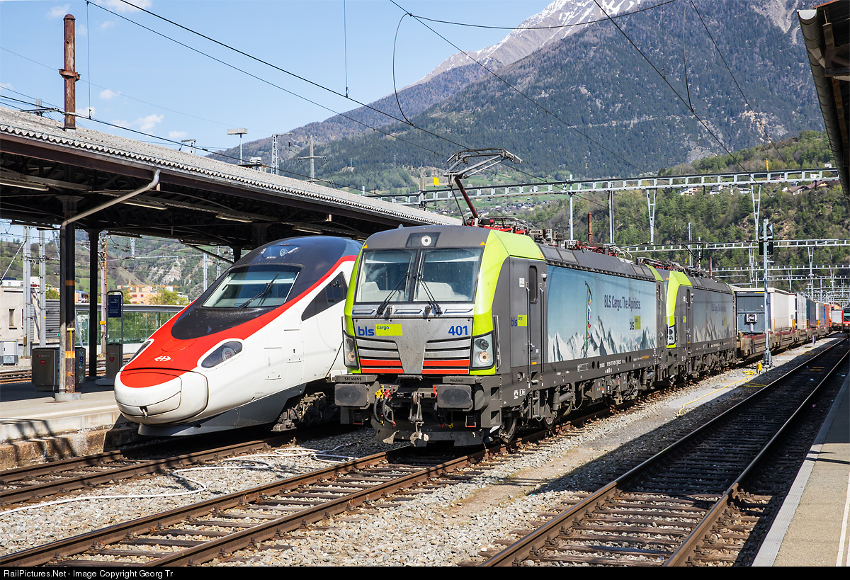 Siemens VECTRON locomotives Re 475 # 401 and 403 of BLS Cargo came from Domodossola to Brig with the "Cargo Beamer" intermodal train, while the highspeed tilting train RABe 503 # 014 of the SBB is running the Eurocity 39 from Geneva to Milan.