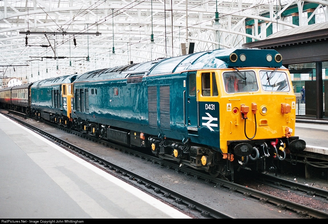 Today there is a public Open Day at Polmadie depot, Glasgow. In connection with this, a thirteen-coach private charter train has run up to Glasgow. I have just alighted from it, having travelled from Stafford overnight. Recreating a scene from the 1970s when pairs of 50's were rostered power for express passenger trains on the London-Glasgow route, preserved pair D431 and D449 rest 'on the blocks' in the early morning after a fault-free journey. Later in the day, the return south will be equally impressive. A day to remember!