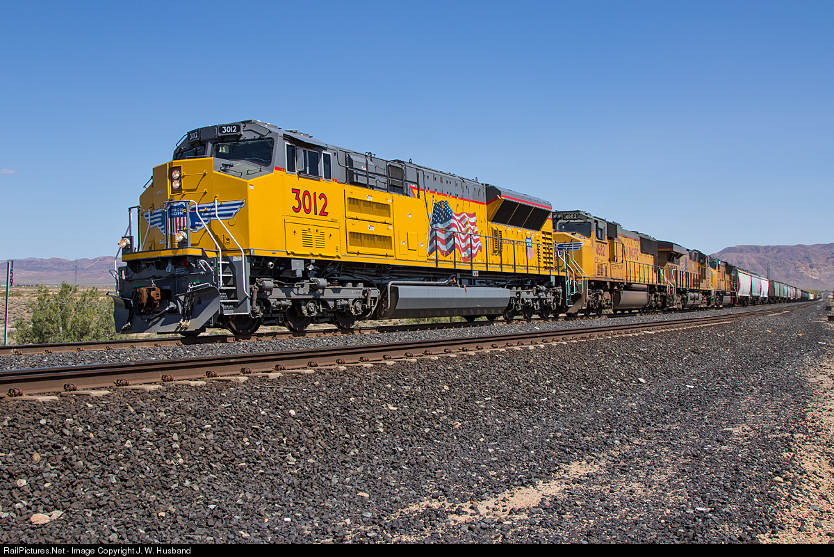 | About to enter BNSF trackage at Daggett, the UP 3012 leads the MSCWC out of Yermo and toward Cajon Pass and eventually West Colton. To date this is one of only a few SD70ACe-T4 engines working on the entire UP roster. |