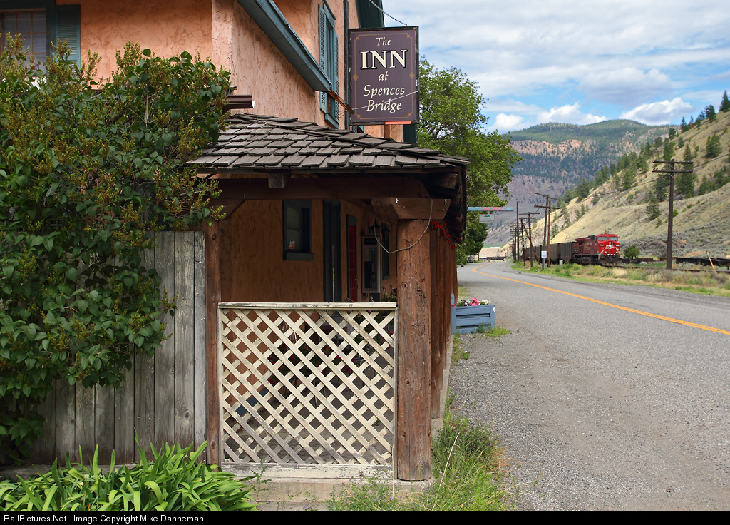 The doorstep of The Inn at Spences Bridge is almost on the Canadian Pacific main line (and literally is on Nicola Highway 8—watch your step…) at this crossroads in the Thompson River Canyon in British Columbia. On July 22, 2011, a CP coal train rumbles eastbound through town.