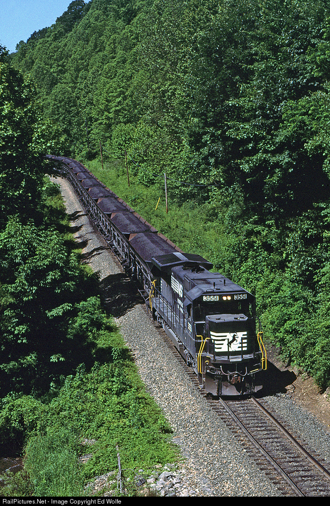 NS J03, Westmoreland Coal's Dump Train, approaches Appalachia on the ex-Southern's St. Charles Branch. J03 is destined to Wentz, on ex-IRR trackage, for unloading.