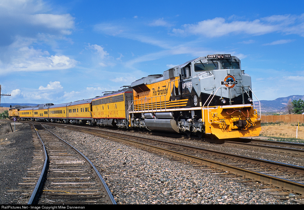 Union Pacific EMD SD70ACe No. 1989, the Rio Grande heritage locomotive, leads a UP Operation Lifesaver special at De Beque, Colorado, on June 15, 2009. Behind No. 1989 is UP E9B No. 963B, and on the other end of the four-car special is GE AC4400CW No. 7250 used as lead locomotive on westbound trips back to Grand Junction.