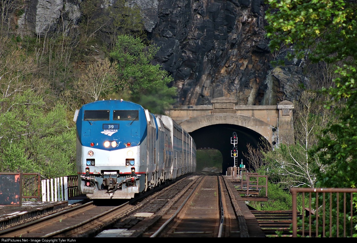 | Amtrak's Capital Limited crosses the Potomac river in Harper's Ferry, West Virginia after exiting the West portal of the Harper's Ferry tunnel. |