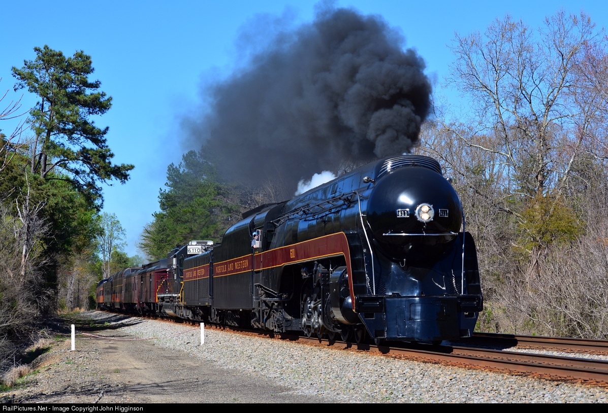 N&W 611 rolls down the former Southern Railway mainline, leading the southbound return portion of an excursion between Spencer, NC and Lynchburg, VA. Behind the auxiliary water car, NS SD40-2 6110 is along for the ride, helping the J to conserve coal on the 300+ mile round trip journey.