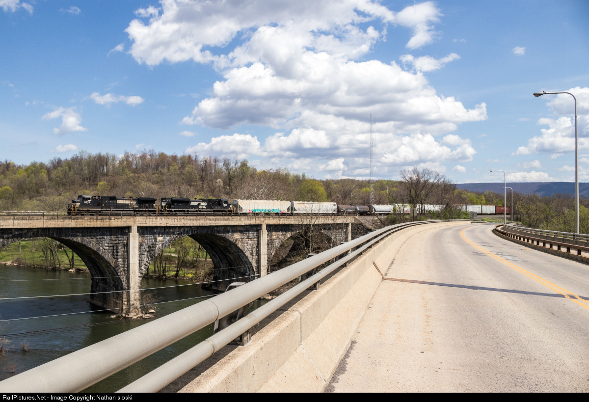 NS 19G sails west over the old stone arch bridge in Mt Union, PA with NS 9372 and NS 1028 leading.