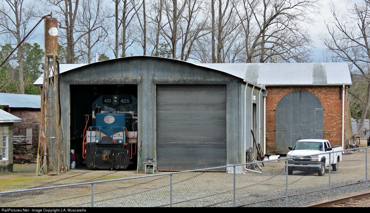 Aberdeen & Rockfish Railroad 405 rests in the shop bay while work is completed on the engine. The layout of the A&R shops looks like something you'd see on a model railroad!