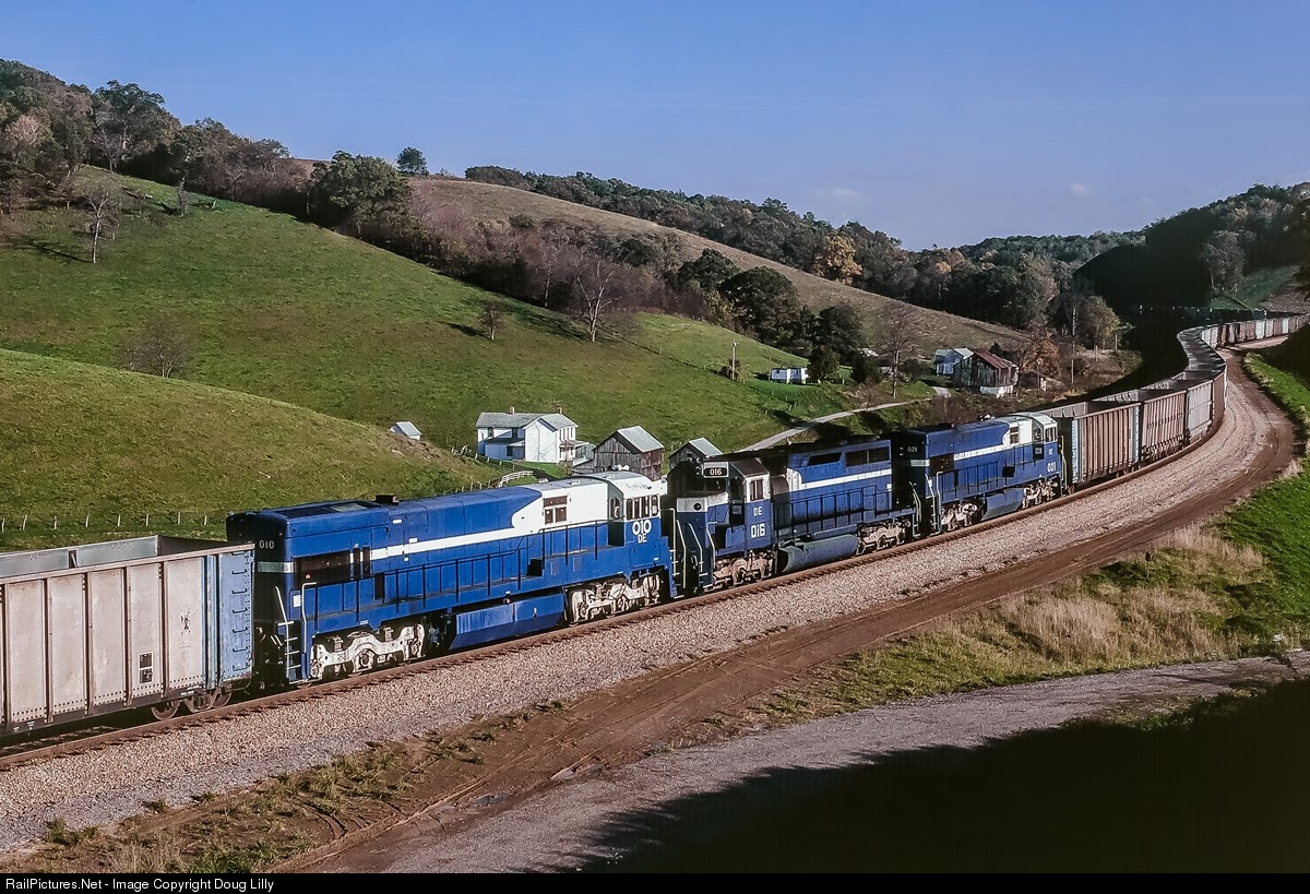 | Mid-train helpers assist a Detroit Edison hopper train that is approaching its loading point at the Bailey Mine. The SD40 appears to be in the original blue and silver paint scheme, while the U30C’s have been repainted in the newer blue and white. |