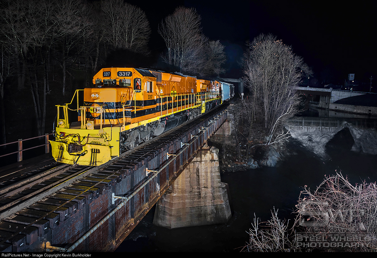 New England Central Railroad train #324-19 is seen heading southbound across the White River at Bethel, Vermont, where a small hydro dam is visible as well as the steep angled Route 12 bridge overhead. The 324 is led by NECR SD40(T)-2 3317 and PWRZ B40-8W 4007, the latter debuting in service in its new paint. The train is seen at 0240 hrs on April 20, with lighting provided by a four Alien Bees B1600 flash, ISO 200, F5.