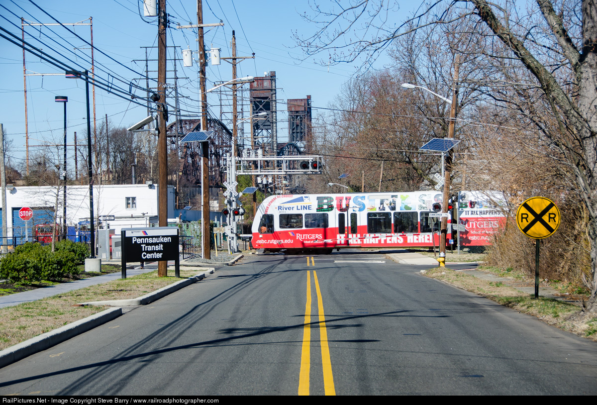 | A RiverLine train crosses Delair Avenue at the Pennsauken Transit Center. In the background is the massive Delair lift bridge that carries New Jersey Transit's Atlantic City trains and Conrail Shared Assets freights across the Delaware River into Philadelphia. |