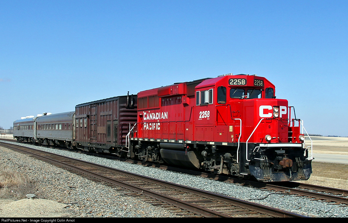 | CP's track test train seen on the relatively new Netook siding between Bowden and Olds. Led by GP20C-ECO 2258 the train comprises Box car 424994 tool/generator car, coach #65 accommodation car (ex Amtrak Budd car) and track evaluation car #64 (ex Amtrak Pullman Standard car) |