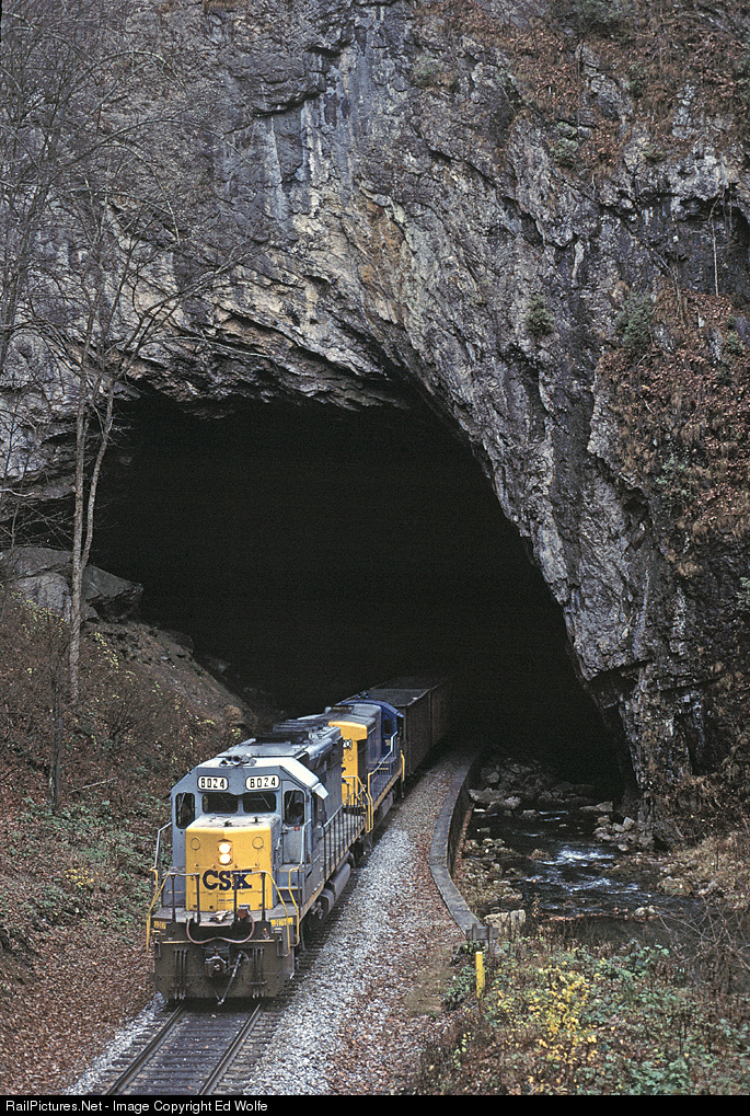 The pushers on CSX 7521 East, running on NS trackage rights between Big Stone Gap, Virginia and Frisco, Tennessee, enter the west portal of Natural Tunnel. Tiny Stock Creek, evident to the right, helped carve the tunnel through the ages.