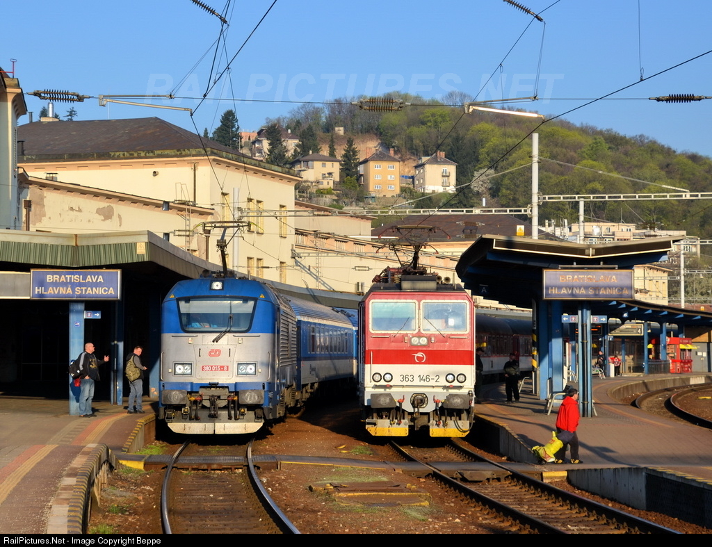 Here are two electric SKODA locomotives, on the left a class: 380 of Czech Railways, the other a class: 363 of Slovak Railways, are heading for their passenger trains awaiting departure.