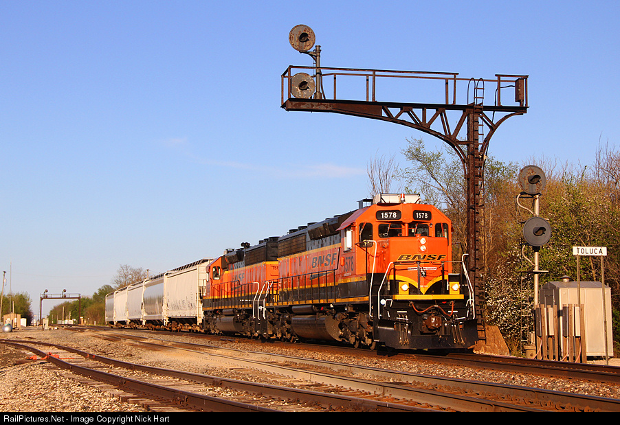 A pair of former Santa Fe SD45-2's lead the L CHI101 Streator turn under the ATSF searchlights in Toluca. These units now wear the H3 scheme are classified as SD40-2R's.
