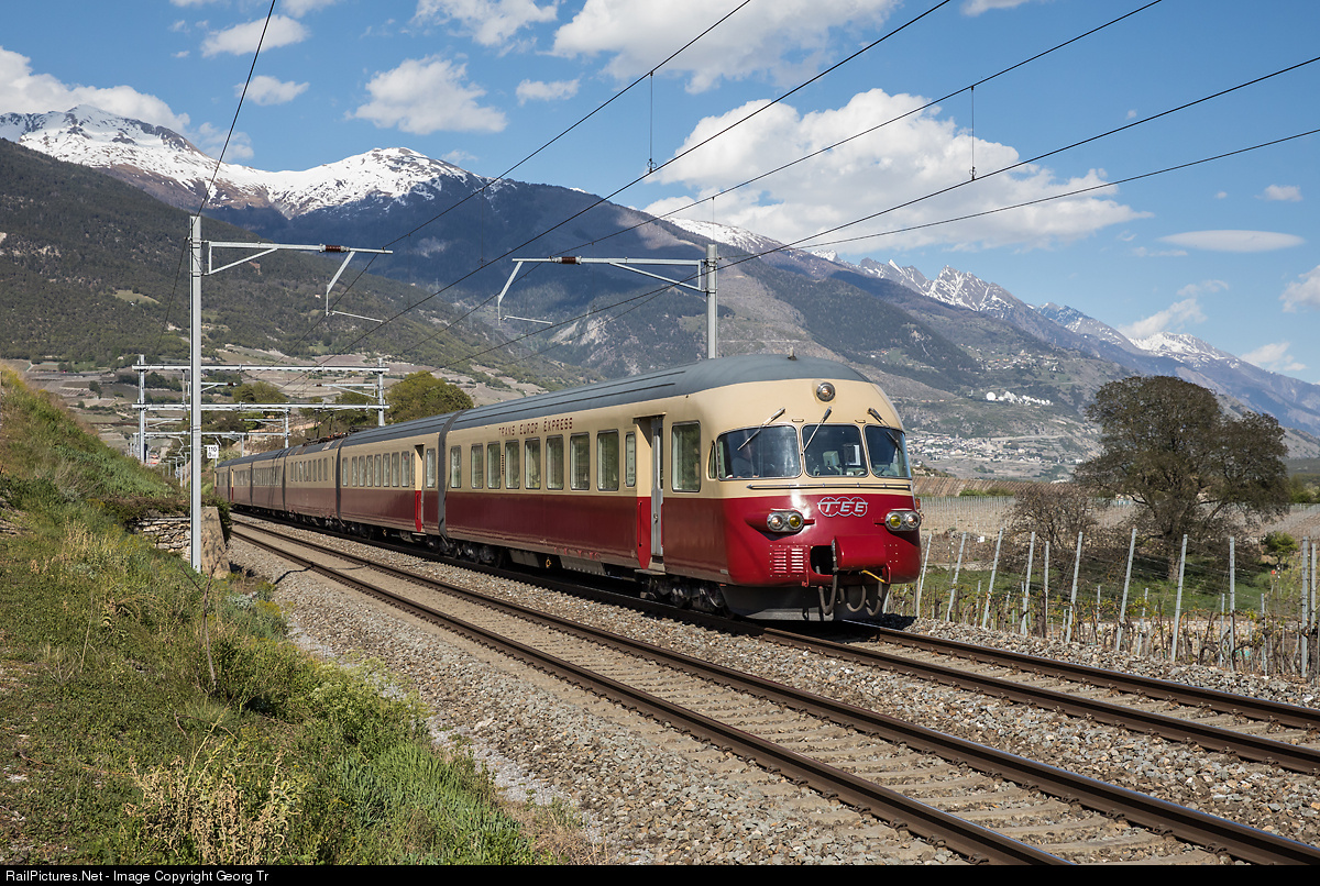 60 years Trans Europ Express (TEE) 1957 to 2017, this was the reason for a journey of the only first class RAe TEE II trainset # 1053 of SBB Historic to Domodossola. The train ran from Olten via Berne and the Lötschberg mountain line to Brig, then through the more then 19 kilometer long Simplon tunnel to Domodossola/Italy. The return trip went back through the Simplon tunnel to Brig, then through the Valais via Lausanne-Berne back to Olten. The electric RAe TEE II trainsets, capable for the 4 electric power systems of Europe, were built in 1961 (4 trains) and 1966 (fifth train) and had 5 cars including sixaxle motor van with kitchen and dining car with a bar, another first class coach was added in 1966 to bring the seat capacity to 168. From july 2nd 1961 this fast (up to 160 km/h), comfortable and elegant first class trains ran the TEE Cisalpin between Paris and Milan via the Simplon for 13 years till may 25, 1974. Then the Cisalpin was changed to a loco hauled train with a larger capacity. The RAe TEE II 1053 is running through the vineyards between Salgesch and Sierre on his former CISALPIN route through the Valais. From the stop in Brig till this point the average velocity was about 127 km/h this day, with points up to 160 km/h.
