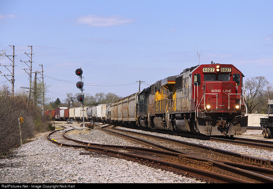 | SOO 6027 leads train 470 through Northbrook, passing the Milwaukee Road searchlights that are still guarding the plant at "Tower A-20." |