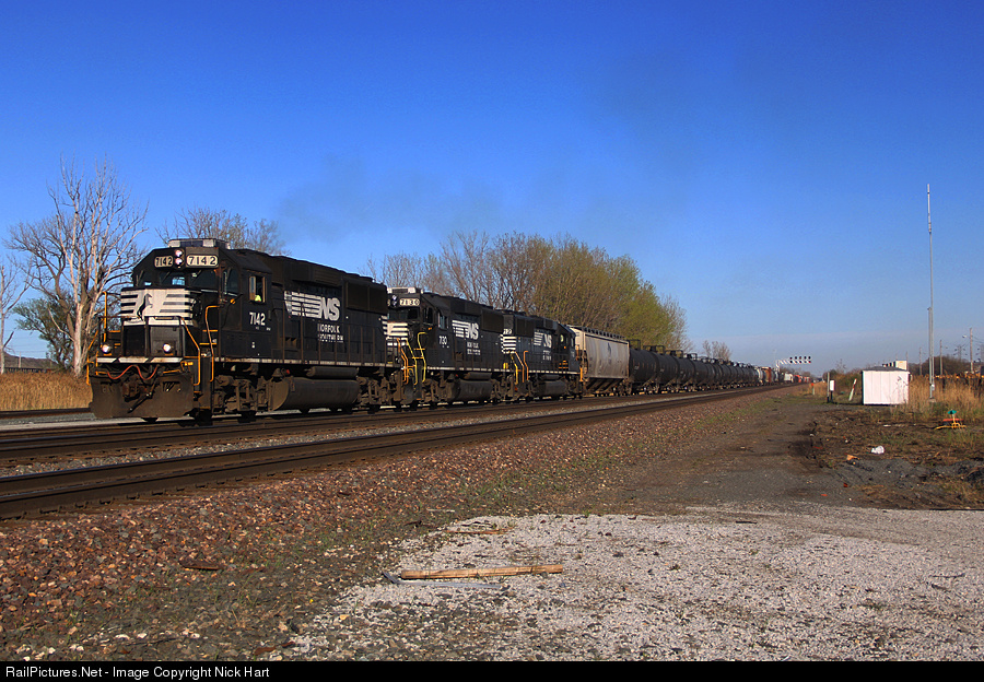 | NS GP60's 7142, 7130 and 7112 lead 35J west through Pine Junction, bound for IHB's Blue Island Yard in Riverdale, IL. A mighty fine sight! |