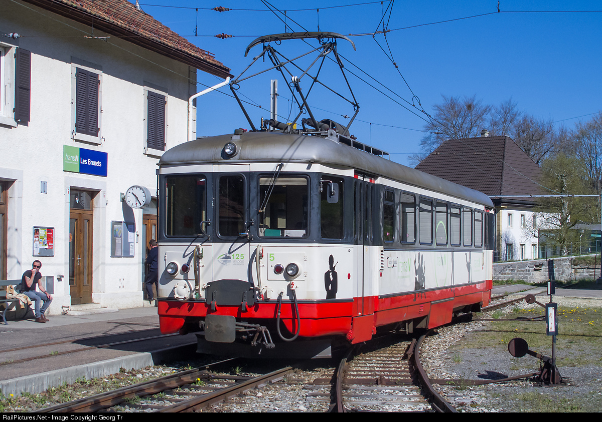 Railcar BDe 4/4 # 5 of the 1 meter gauge line from Le Locle to Les Brenets, operated by Transports Publics Neuchâtelois (TransN). This vehicle was built in 1950, when the 4,2 kilometer long line was electrified with 1500 V DC, by Reggiane/Italy, BBC and SAAS. On this short line there are the BDe 4/4 # 3 and # 5 and a cab car Bt # 12 in service. 1 vehicle is needed for the timetabled service.