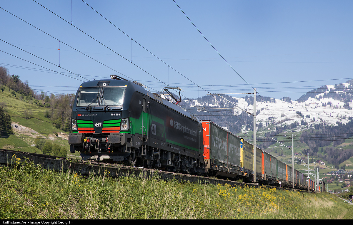 | 6400 kW Siemens Vectron MS (Multi System) locomotive 193 # 259 of European Locomotive Leasing (ELL), rented by SBB Cargo International since october 2016, is pulling the Wetron intermodal train 40015 from Blerick (Venlo) to Gallarate (Busto Arsizio Terminal), between Schwyz and Brunnen. |