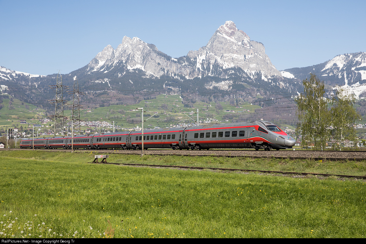 | Highspeed tilting train ETR 610 # 008 of Trenitalia as Eurocity 21 from Zürich to Milan between Schwyz and Brunnen, with the Mythen mountains in the background. |