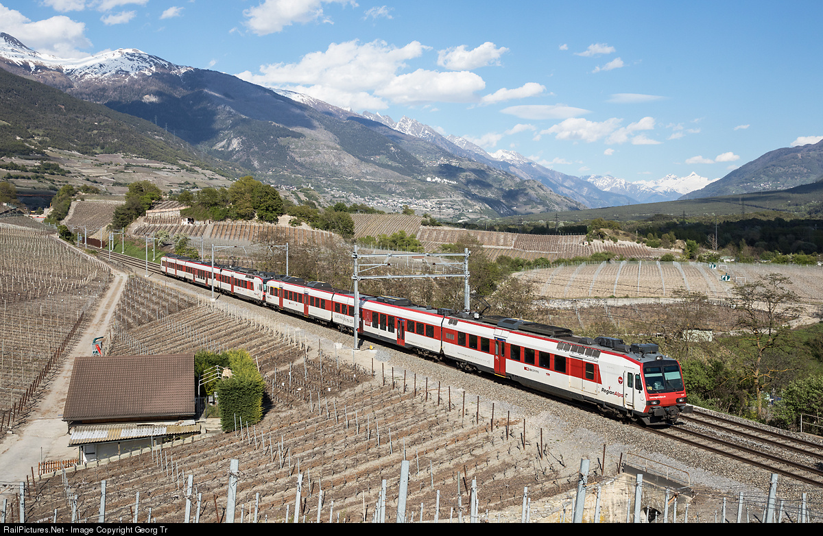 | Two coupled RegionAlps "Domino" push pull trains with RBDe 560 DO RA # 407 are running the Regio 6125 from St-Gingolph to Brig, between Sierre and Salgesch. The "Domino" of RegionAlps are fitted with automatic couplers "Schwab Metro". |