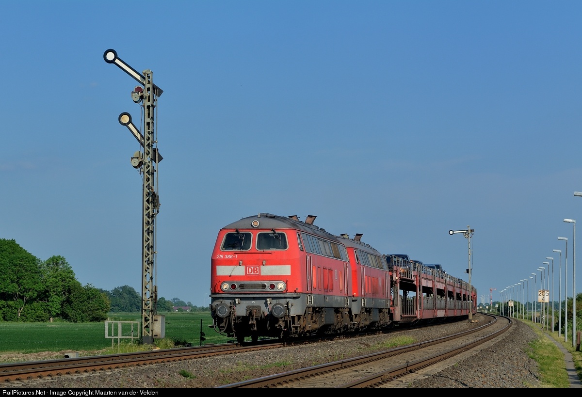 DB 218 386-1 + 218 314-3 with the Sylt-shuttle from Niebüll to Westerland.. At the tail of the train is added a DMU series 628 for passenger transport. This part runs as D 1452 from Bredstedt to Westerland. This was a messure for political reasons. With running a passengertrain could DB claim the slot on the track for its profitable Sylt Shuttle, which could otherwise be claimed by other open acces operators.