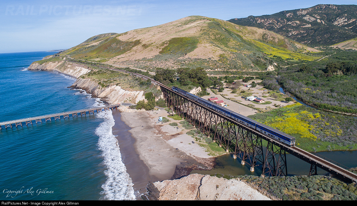 The first southbound Amtrak of the day, Amtrak 774, crosses the 811-foot-long span of the Gaviota trestle on its way south toward Santa Barbara.