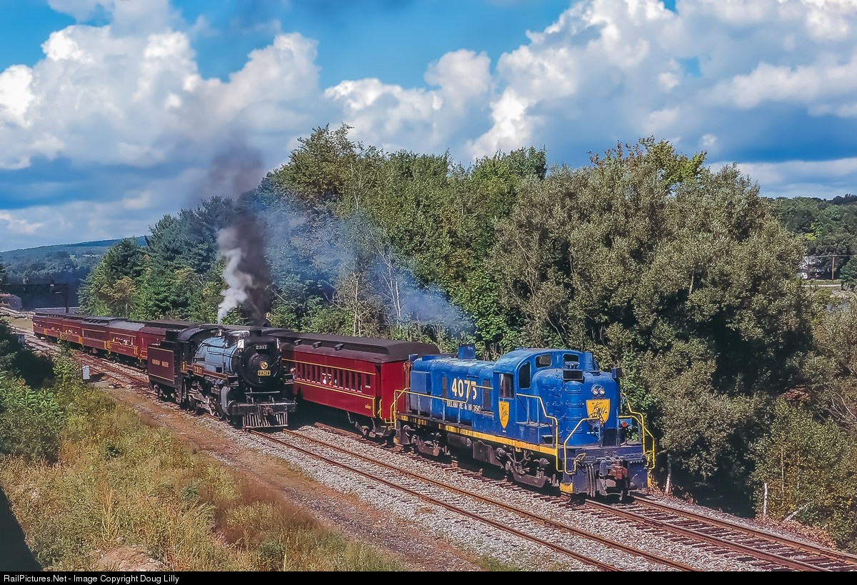 During the first season of operations after its move from Vermont to Pennsylvania, Steamtown’s trains travelled between Scranton and Elmhurst, which was the location of the first available siding. It was a facing point siting with no runaround, so two locomotives were needed to facilitate the train’s reversal. CP 4-6-2 2317 led the train up the grade out of Scranton, with a diesel helper, usually ex-D&H RS3 4075. Upon arrival at Elmhurst, the Pacific would uncouple and then pull forward into the siding. The diesel would pull the train past the 4-6-2, and the 2317 would then back through the switch, and couple to the train to lead it back to Scranton. Here the Pacific waits as the ex-D&H, nee B&M RS3 pulls the train past, three weeks and a day after the first excursion in Pennsylvania.