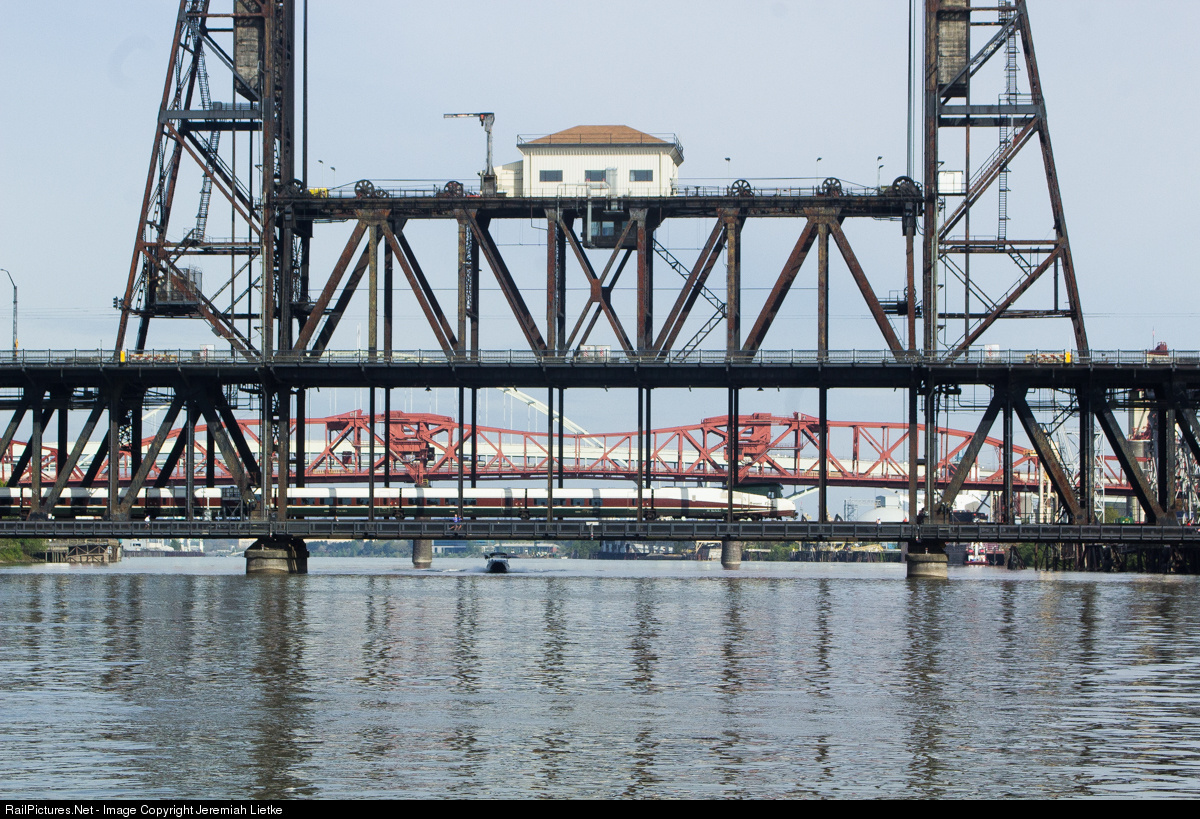 One of Amtrak's newer Talgo sets embarks on its journey south to Eugene, crossing the Steel Bridge as it does so.