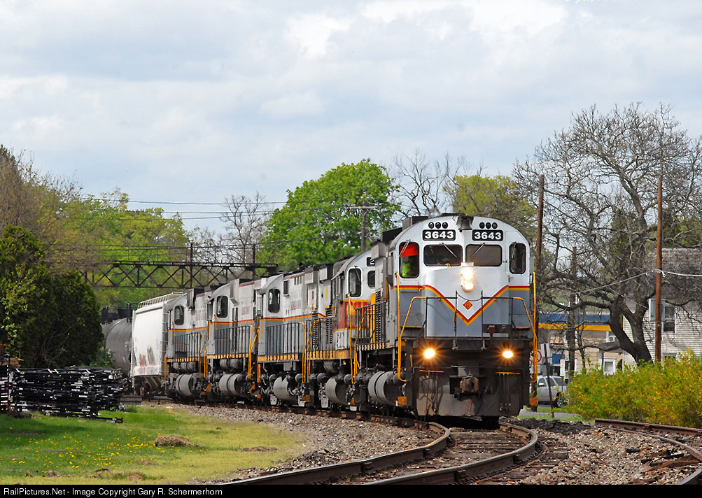 | The crew of today's Saturday PT98 have been busy with extensive switching done at Tobyhanna and Mount Pocono including a drop off at Bestway Lumber at Cresco. Five Centuries rumble by Gravel Place as the Sun Gods smile through the low clouds and the temperature soars up during the afternoon. DL M636 3643 leads the 2461 2423 3000 & 3642 on this fine spring day. |