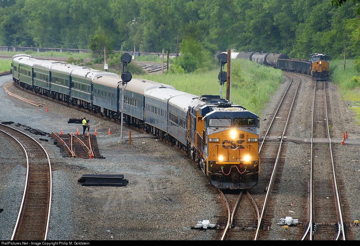 CSXT P930-01 Office Car Special re-enters the Castleton Subdivision. First, after having pulling east onto the Castleton Sub via the River Sub "east wye". It then performed a reverse move westward through the CP-SK interlocking to go from Track 2 to Track 1. Then forward again to be switched from Track 1 onto the Port Subdivision to continue its trip north to Saratoga Springs for the Saratoga Stakes horse racing series. All the while a eastbound manifest waits on the North Departure Track. Ground crews had to spike all turnouts just prior to and then remove the spikes after OCS movements for regular freight traffic made this a very time consuming maneuver. Also, this was an unusual OCS move as the lead locomotive was not the usual F40 power CSX has assigned to their OCS' (there were two other OCS' this day in other areas). CSXT #801 also has the distinction of being the first CSX locomotive with inward facing cameras. CSX Albany Division Castleton & River Subdivisions CP-SK & East Wye leg Selkirk, New York, USA 01 August 2014 - 16:00 EST CSX P930-01 - CSX Office Car Special CSX #801 [GE ES44AH] CSX #9999 [EMD F40PH-2] CSXT #994363 "Kentucky" CSXT #994011 "Youngstown" CSXT #994008 "Mississippi" CSXT #994315 "Indiana" CSXT #994300 "North Carolina" CSXT #994317 "Baltimore" CSXT #994307 "Waycross" CSXT #994500 "Ohio" CSXT #994310 "West Virginia" CSXT #994009 "Alabama" © 2014 - Philip M. Goldstein
