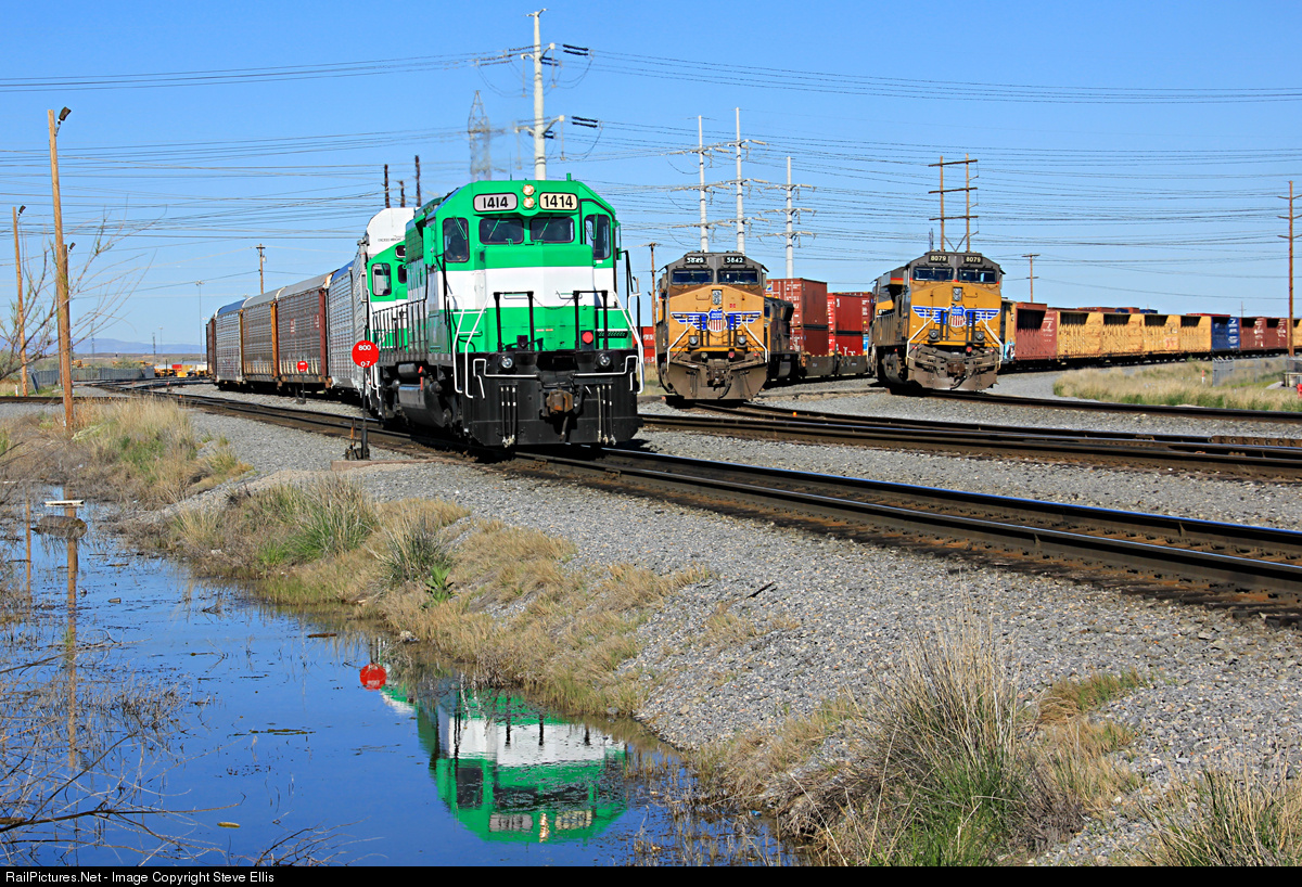 | S&S Shortline 1414 and 116 are contracted to work the Union Pacific Intermodual yard on the west side of the Salt Lake Valley. They always do there switching at the east end of the yard. They are only accessible briefly when they pull out of the yard with a string of cars. 116 is former MRL GP9 116. A couple UP trains are on the ready track.