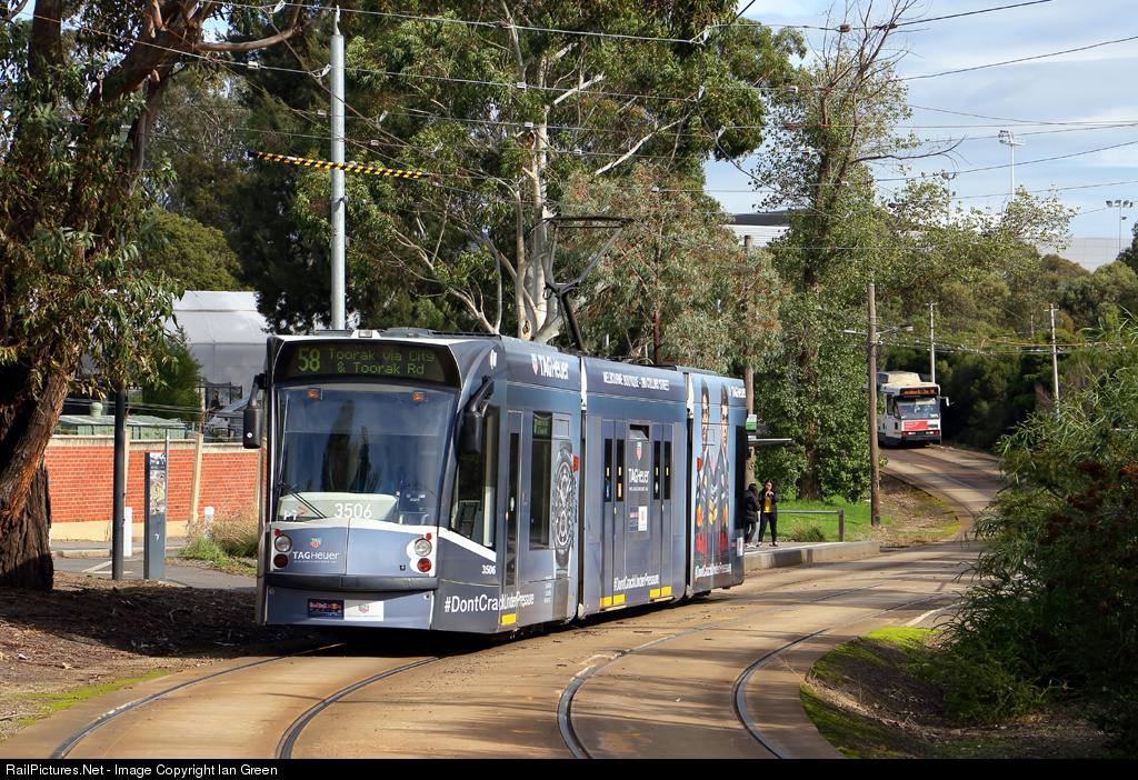 | Recently introduced on the new route 58 between Toorak and West Coburg, Combino tram 3506 negotiates the S curves at Royal Park. |