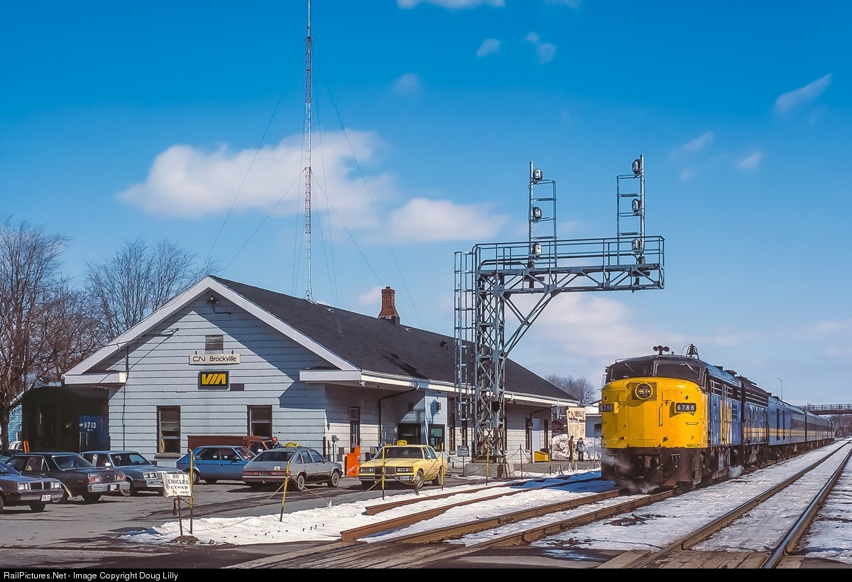 Change is in the air as a westbound VIA train makes its station stop at Brockville, Ontario. A new station track and a new cantilever signal are under construction. Soon Brockville will lose its operational charm as a place where Toronto-Montreal/Ottawa trains are split, or combined in the other direction. When this happens, there will be no more need for the former CP track behind the station where FPA4 6783 is waiting for the nest Ottawa connection. The 1972 station will get a brick siding makeover in 2015, and at some point over the next three decades, the signal bridge will be cut down to be a signal mast as seen in Steve Arnot’s 2016 photo.