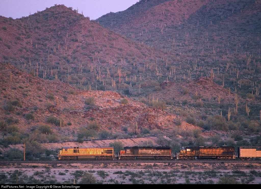 | With part of the sun already below the horizon, UP 657 East roars slowly up the grade at Shawmut surrounded by the many saguaros that populate the area. |