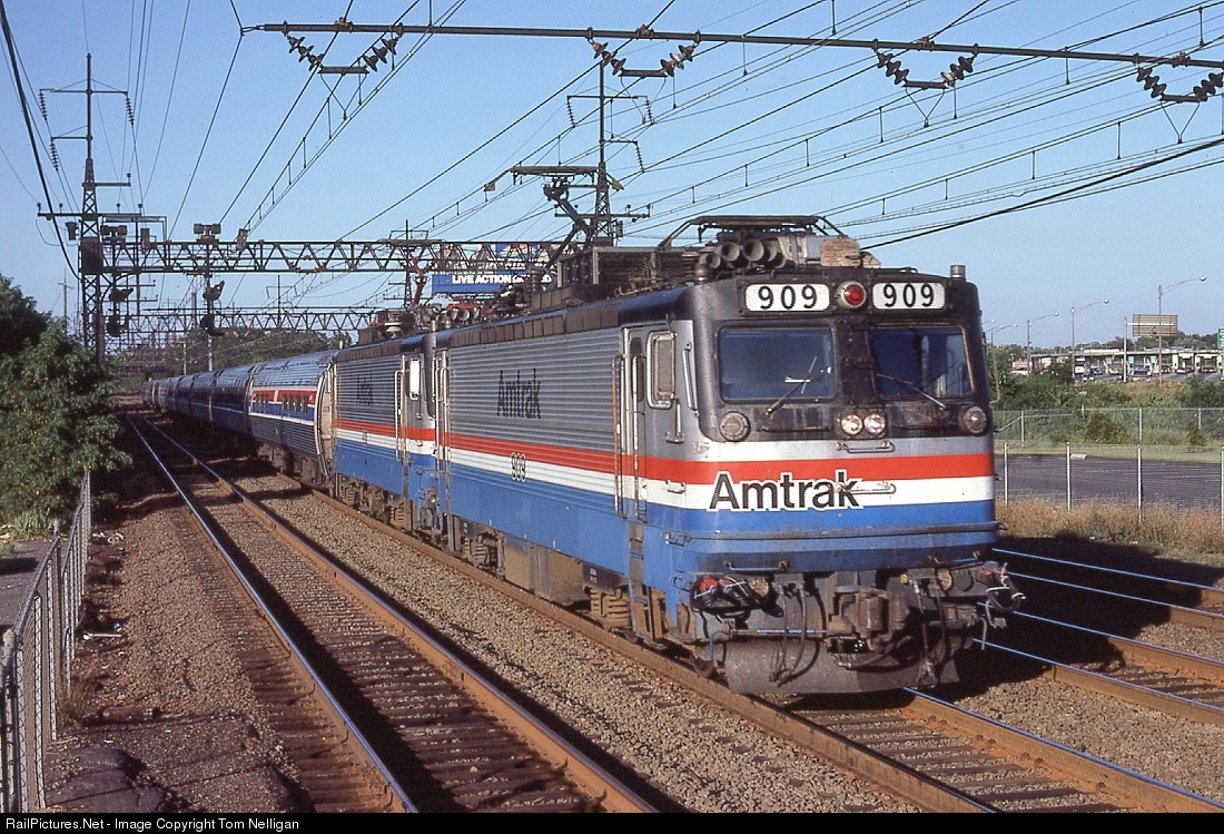 | Amtrak's small but powerful AEM-7 electrics were such a dominant presence on the Northeast Corridor for more than thirty years that I find it difficult to think of them as a vanished breed. A pair of them led a Washington-bound corridor train through Stratford, CT, on an autumn afternoon. |