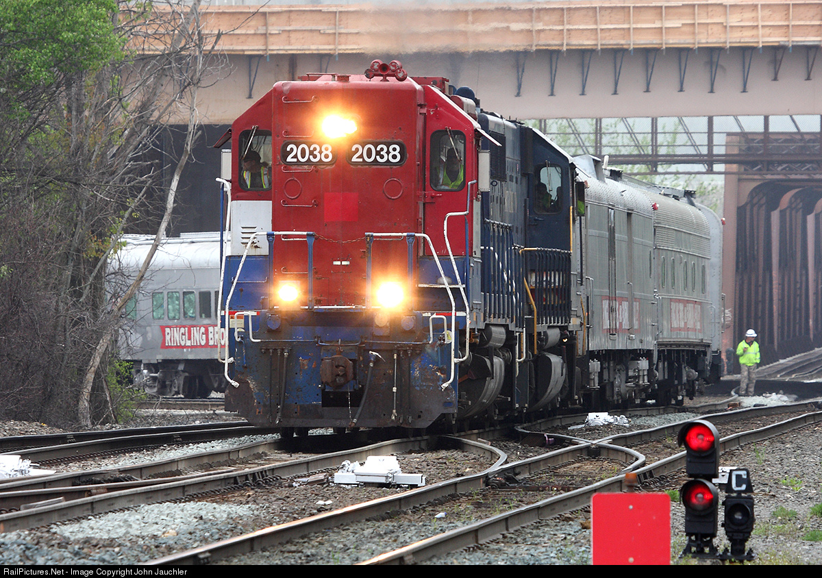 First leg of the RBBB Red Unit circus train's last trip from Hartford to Providence. Connecticut Southern did the honors from Hartford Yard into Springfield. Here, the train is seen coming off Amtrak's Springfield Line onto CSX's Boston Line to allow it to continue over to Worcester after a power swap. At Worcester, Providence & Worcester will deliver the train the last miles into Providence. The CSX bridge over the Connecticut River can be seen in the background.