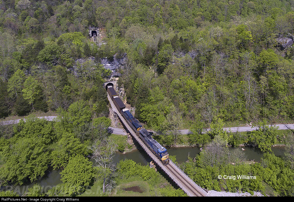 CSXT's CC Sub runs 176 miles from the Cincinnati Terminal near Spring Lake to Dortha near Corbin, KY. The railroad cuts thru some rugged mountain area south of Berea, KY, as they cut thru the Daniel Boone National Forest. Near Orlando the railroad crosses thru a few tunnels and bridges as they twist along Roundstone Creek. Here a southbound coal train pops out of the tunnel #14 and into #15 near MP 146.