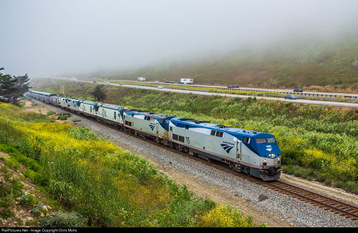 | The locals call it May Gray. During this time of year fog rolls in off the ocean and moves inland. Southbound No. 11 the Coast Starlight has a impressive lashup today. Along with the usual P42's are two new Siemen Chargers in Amtrak Cascade Livery, followed by two deadheading P42's all elephant style. The Starlight train sets are only running from Los Angeles to Sacramento due to a derailment on an old truss bridge at Sims Ca. Full service has not been restored yet. |