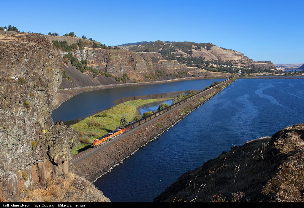 A westbound BNSF coal train crosses the long fill west of Lyle, Washington, while negotiating scenic Columbia River Gorge on the afternoon of September 24, 2016.