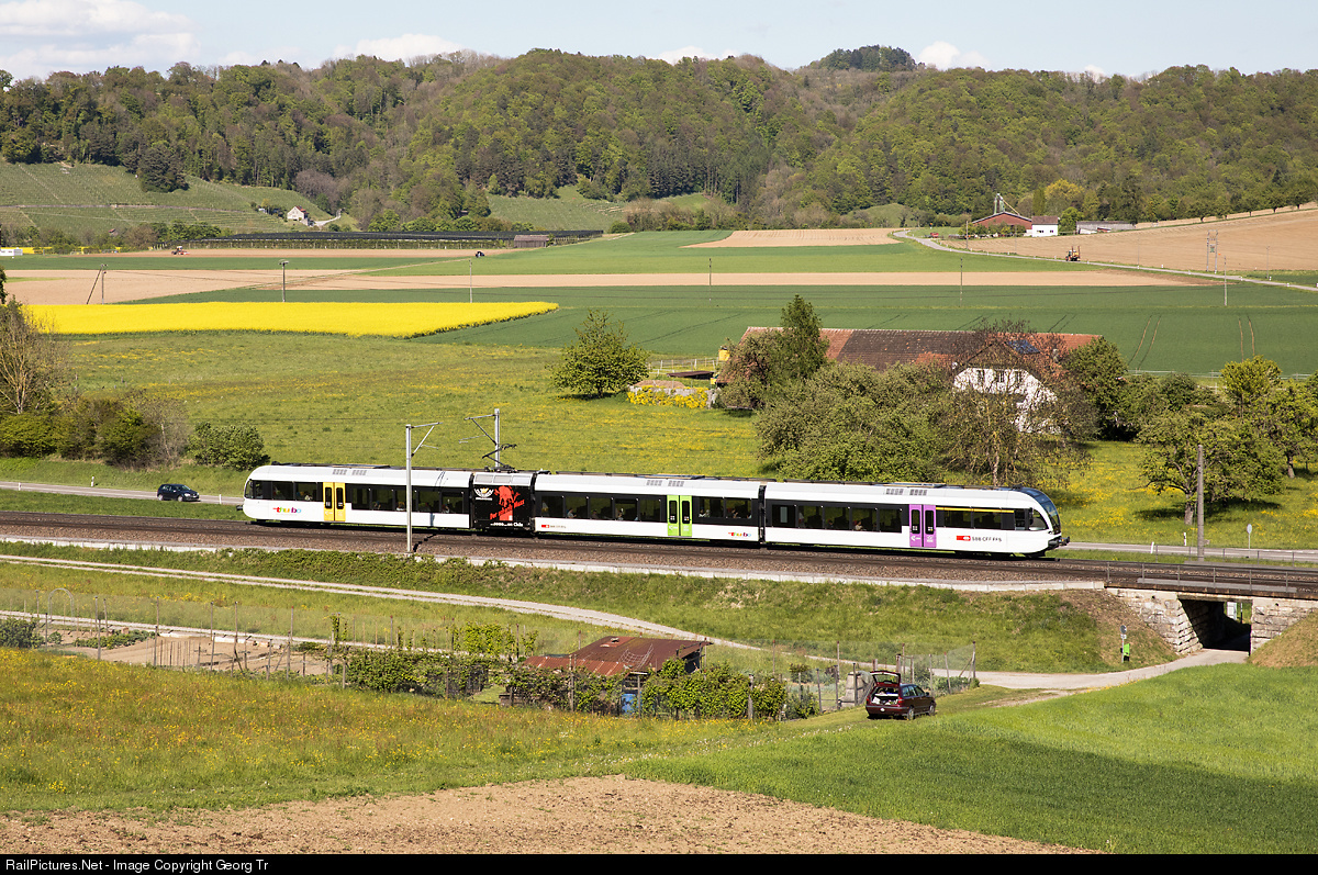 | Articulated lowfloor trainset RABe 526 # 783 "AKL" of the Thurbo (built by Stadler Rail) is running the S 41 service 19865 from Waldshut to Winterthur, and left Eglisau shortly. |
