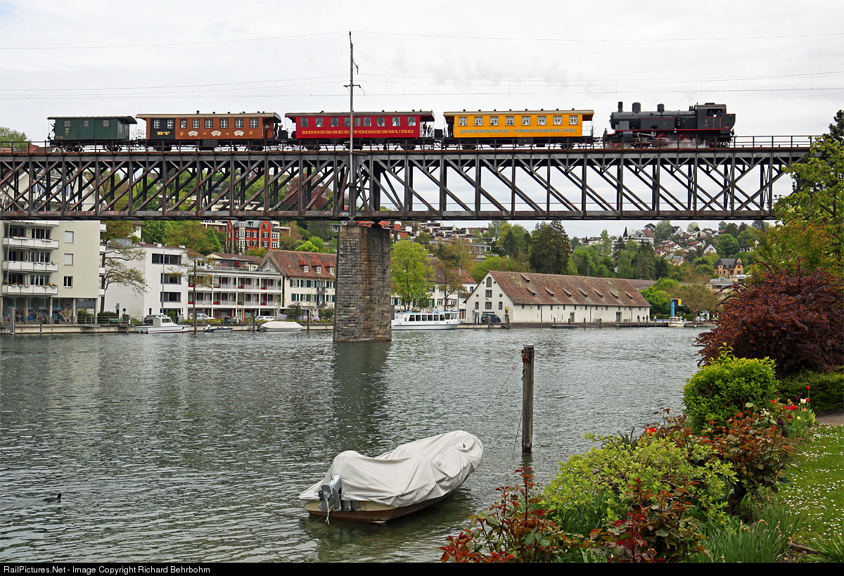 | Eb 3/5 # 9 is crossing the Rhine bridge between Schaffhausen and Feuerthalen. The colorful cars were owned former by the Bodensee–Toggenburg-Bahn and used specially for groups. This special train was called "Amor Express". |